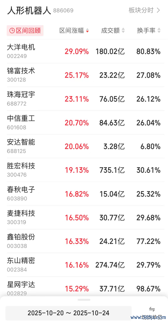 10月20日至10月24日,人形机器人板块上市公司股价涨幅显著。同花顺数据显示,大洋电机涨幅达29.09%,锦富技术(维权)、珠海冠宇、中信重工、安达智能涨幅均超过20%。